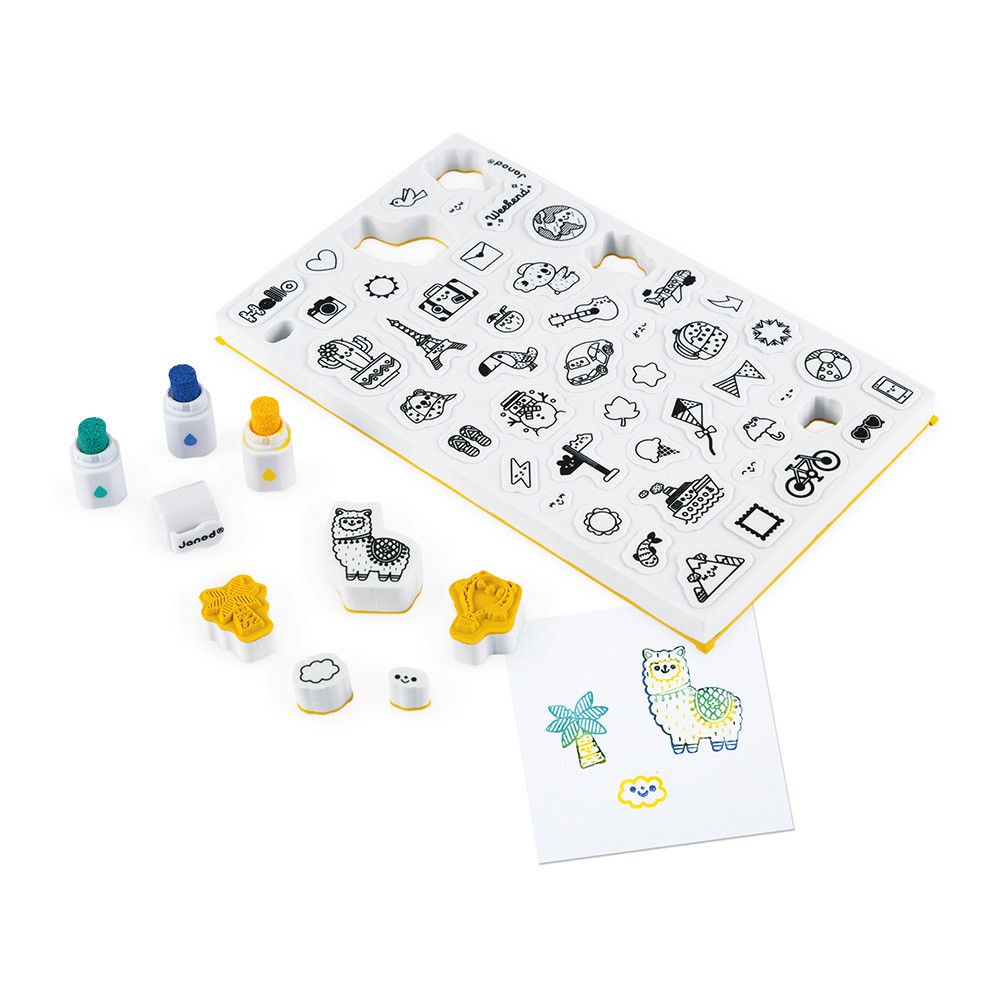 Набір для творчості Штампи Світ від французького бренду Janod містить лист з 50 невеликих, попередньо вирізаних, пінопластових штампів з різною графікою, на тему подорожей по всьому світу. Штампи зроблені з приємного на дотик еластичного пінопласту і гумовою поверхнею, на якій нанесено зображення штампування. У набір також входять три маленькі чорнила у вигляді маркерів: жовтий, темно-синій і бірюзовий. Завдяки їм один штампік може бути пофарбований в кілька кольорів одночасно. Також в комплекті є коробка, в якій можна зберігати штампи і фарбу.