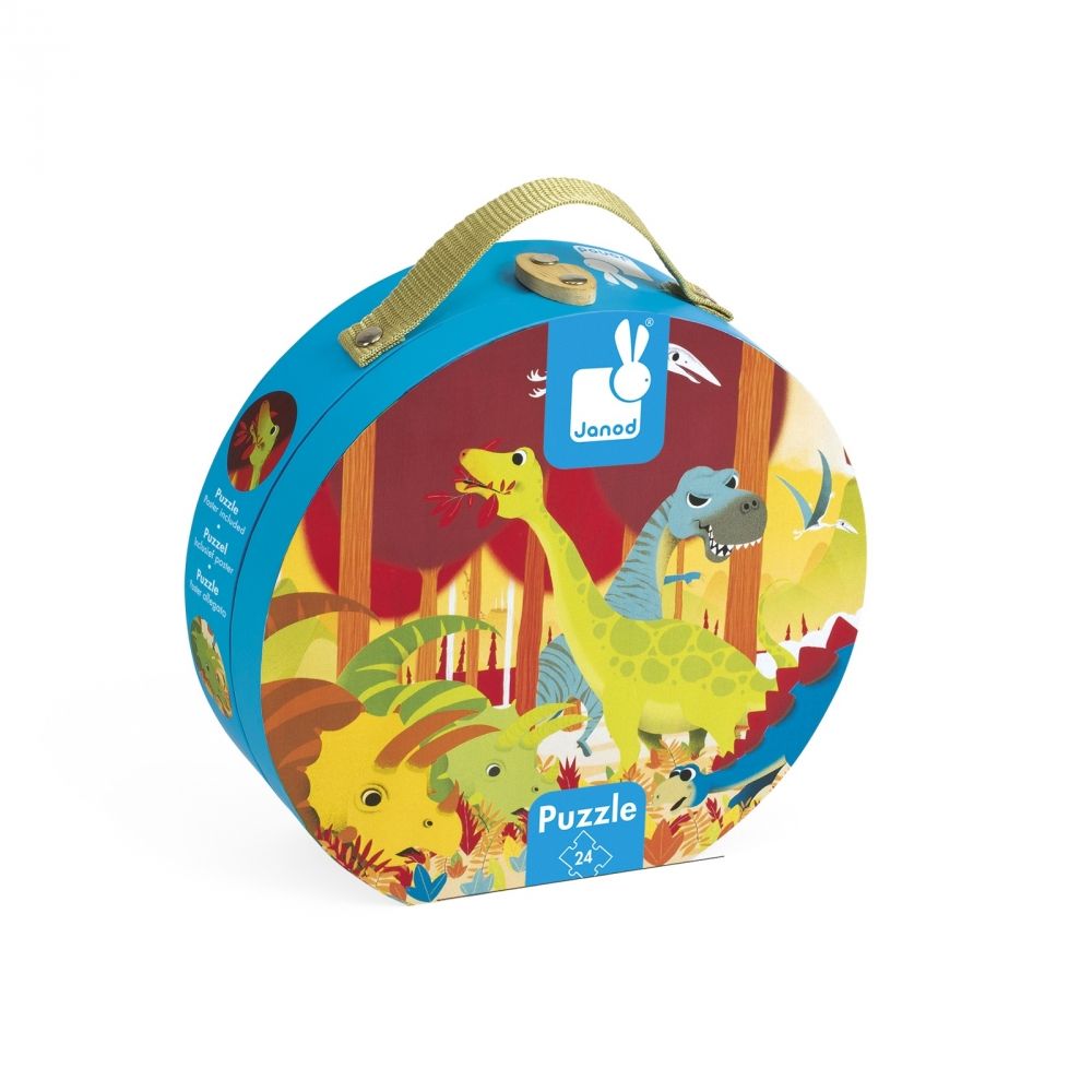 Пазл «Динозаври» французького бренду Janod – цікава розвивальна іграшка. Набір поміщений у яскраву валізку, виготовлену з дуже цупкого і якісного картону. Всередині валізки ви знайдете 24 деталі для складання картинки і власне сам постер із зображенням пазлу. Деталі пазлу картонні; вони покриті безпечними фарбами на водній основі. Іграшка для дітей від 3 років.