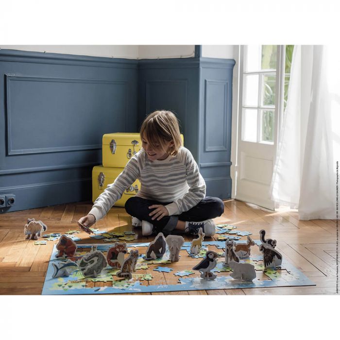 Цей дивовижний гігантскаій освітній пазл дозволить дитині дізнатися про те, де знаходяться під загрозою зникаючі тварини. Цей пазл супроводжується навчальним буклетом, щоб дослідити види тварин і зрозуміти причини їх зникнення. У комплекті 200 елементів, а також 50 картонних тварин, які також повинні бути зібрані.