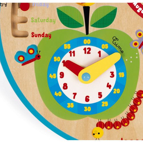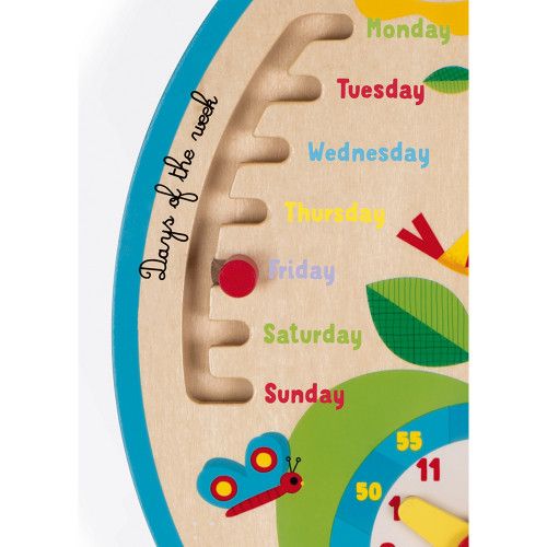 Розвивальна іграшка 2 в 1: календар і годинник. Навчальний набір допоможе дітям дізнатися багато нового про довкілля, зміну пір року. З допомогою іграшки діти зможуть вивчити назви днів, сезонів, навчитись визначати час за годинником. Іграшка дерев’яна, виготовлена з безпечного сертифікованого матеріалу, покрита нетоксичними фарбами на водній основі. Рекомендований вік: 3+. Розмір годинника: 37.5 x 2.7 x 41.7 см.