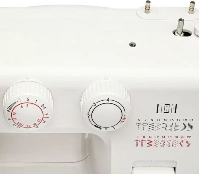 Комплектація:інструкція з експлуатації, Набір голок, Штопальна пластина, Викрутка, Чохол, Шпульки, Лапка для петлі, Розпорювач, Універсальна лапка, Фетрова прокладка, Лапка для блискавок, Электрическая педаль
