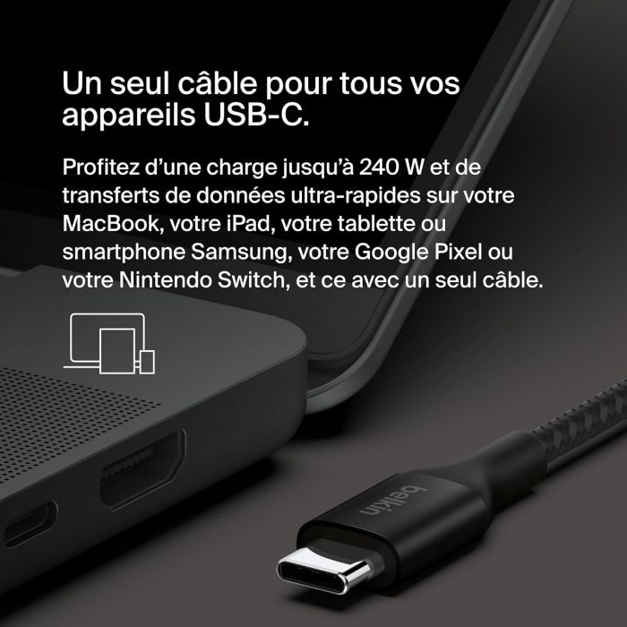Будьте готові від сьогодні і до завтра. Перший кабель Belkin розроблений для розширеного діапазону потужності, сумісний з останніми рекомендаціями USB-IF для пристроїв USB 240 Вт і PD 3.1. Заряджати новітні MacBook, Chromebook, ігрові ноутбуки, iPad та інші потужні пристрої USB-C за допомогою міцного кабелю, який забезпечує безпечну та оптимальну швидкість заряджання.