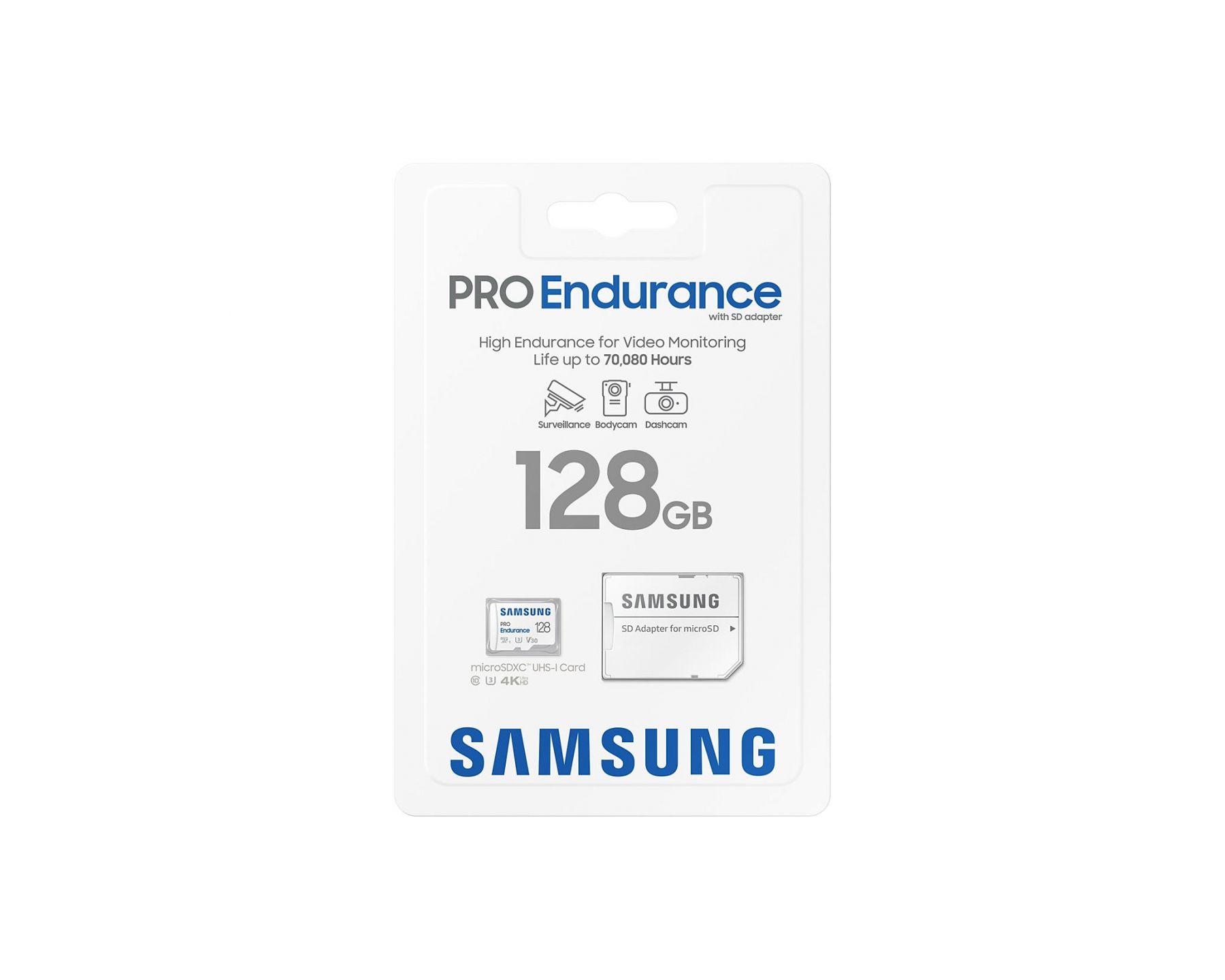 Карта пам’яті Samsung microSD PRO Endurance 128GB розроблена для тривалого запису в екстремальних умовах. Підтримує відео у форматі 4K завдяки високому класу швидкості (Class 10, UHS-I, U3, V30, A2) та високій швидкості читання.