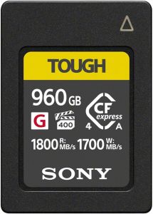 Карта пам’яті Sony CFexpress Type A 960 ГБ Tough поєднує високу швидкодію та надійність для професійної фото- і відеозйомки. Швидкість зчитування досягає 1800 МБ/с, а запису — 1700 МБ/с, із мінімальною сталою швидкістю 400 МБ/с. Міцна конструкція витримує екстремальні температури від -20°C до +85°C.