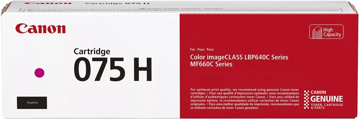 Картридж Canon 075H (6367C002) — оригінальний магента тонер високої ємності для принтерів MF664Cdw, MF667Cdw, LBP646Cdw та LBP647Cdw. Ресурс 2500 сторінок, насичений магента колір, чіткість тексту та графіки без підтікань і розмазувань. Ідеальний для інтенсивного кольорового друку документів, презентацій і графіки!