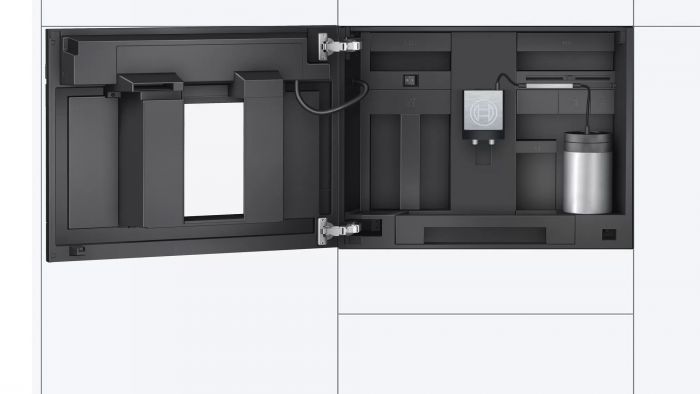 Вбудована кавоварка Bosch CTL636EB6 зможе приготувати одночасно натисканням всього однієї кнопки дві чашки кави, капучино, еспресо, лате, еспресо маккіато. Крім того, можна підігріти воду для чаю або молоко, а також зробити повітряну молочну піну. Прилад потужність 1600 Вт обладнаний безшумним млином преміум-класу місткістю 500 г з жорнами зі зносостійкої кераміки та регульованим ступенем помелу. Для приготування 17 видів різних кавових напоїв пристрій використовує кави в зернах або в меленому вигляді. Модель оснащена містким резервуаром для води об'ємом 2,4 літра та оповіщає про її закінчення спеціальним повідомленням.