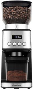 Catler CG510 — професійна жорнова кавомолка з 31 ступенем помелу, LCD-дисплеєм та потужністю 180 Вт. Бункер на 250 г, корпус повністю з нержавіючої сталі, сріблястий колір. Меле як у контейнер, так і прямо в портафільтр (в комплекті 2 утримувачі). Точне дозування за часом або кількістю порцій. Ідеальна пара для домашньої кавомашини рівня еспресо-барів.