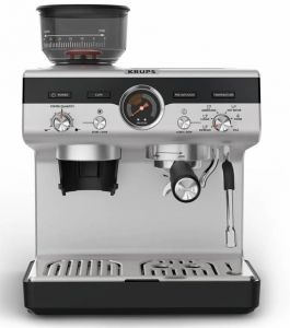 Кавоварка Krups ріжкова Precision+, 3.5л, вдубована кавомолка, ручний капучинатор, 15 бар, чорний-сірий