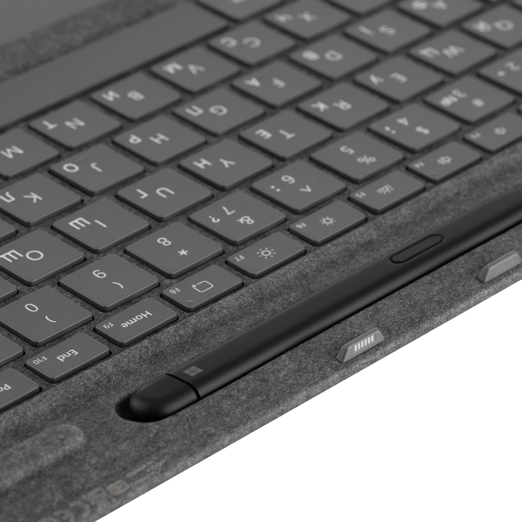 Клавіатура Microsoft Surface Pro із нішею для СТІЛУСУ (платинова) Розроблена з елегантної чорної тканини Alcantara, Microsoft Surface Pro Keyboard for Business with Pen Storage магнітно кріпиться до вашого Surface Pro 10 for Business, щоб забезпечити плавне та комфортне введення тексту, як у ноутбуці. Ця механічна кришка клавіатури також підвищує вашу продуктивність завдяки спеціальній клавіші Microsoft Copilot, вбудованим клавішам швидкого доступу та вбудованій скляній сенсорній панелі. Зручний лоток для зберігання дозволить зберігати ваш стилус Surface Slim Pen for Business під рукою, забезпечуючи легку зарядку.