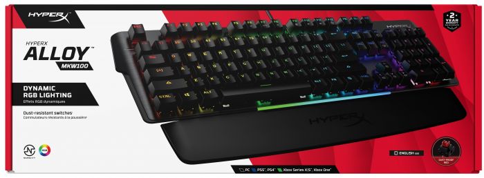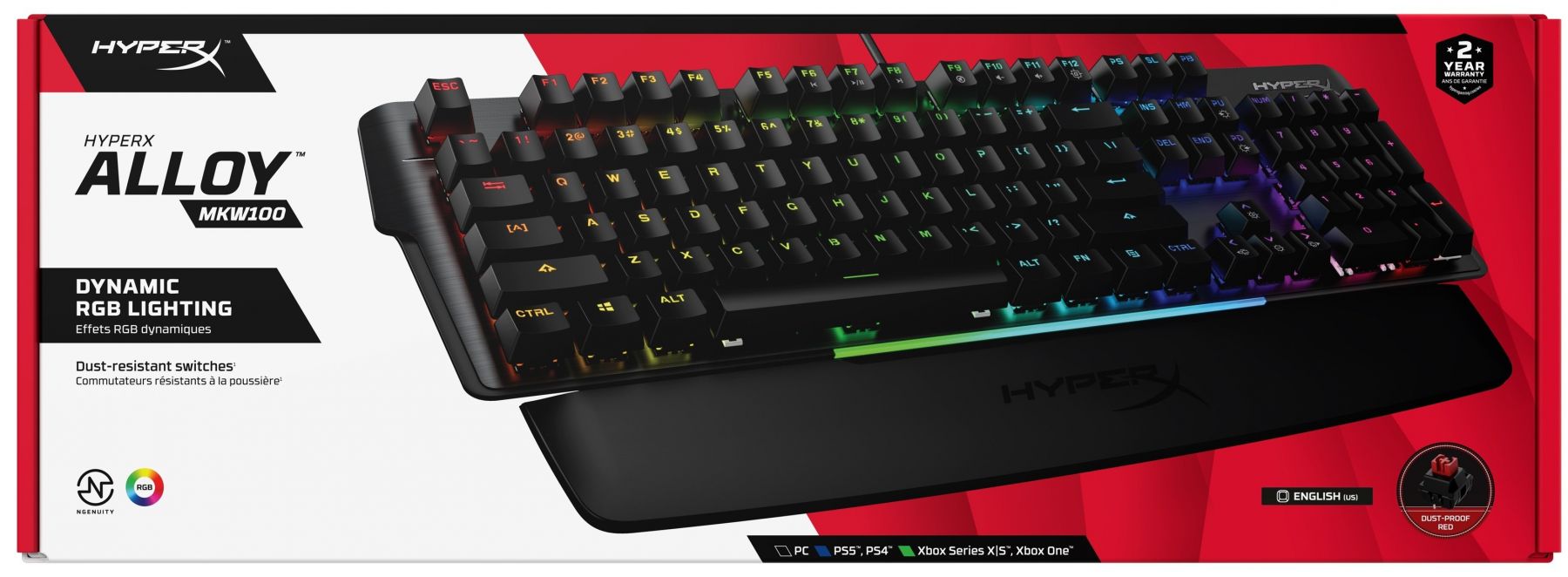 Клавіатура HyperX Alloy MKW100 TTC Red USB RGB ENG/RU, Black 4P5E1AX. HyperX Alloy MKW100 - это доступная полноразмерная механическая клавиатура, которая отлично подходит для игр, работы и учебы. Персонализируйте свою клавиатуру с помощью динамической RGB-подсветки и эффектов, которые можно легко настроить с помощью программного обеспечения HyperX NGENUITY. Alloy MKW100 имеет прочный каркас из матового алюминия и отличается надежной отзывчивостью благодаря пылезащищенным механическим переключателям, рассчитанным на 50 миллионов нажатий. Играйте с комфортом с помощью входящей в комплект подставки для запястья или отсоедините ее, чтобы удовлетворить свои потребности.