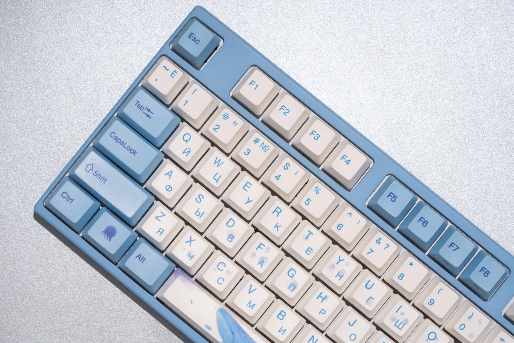 Varmilo Sea Melody – це надихаюча історія морської гладі, реалізована через унікальний дизайн пристрою. Механічна клавіатура для митців, розробників та гравців в унікальному дизайні, що поєднав у собі ніжні лазурові відтінки морської блакиті з класичними білими клавішами. Це деталізація надихаючого підводного світу через художній розпис на елементах клавіатури хвиль, медуз, китів та морської гладі.