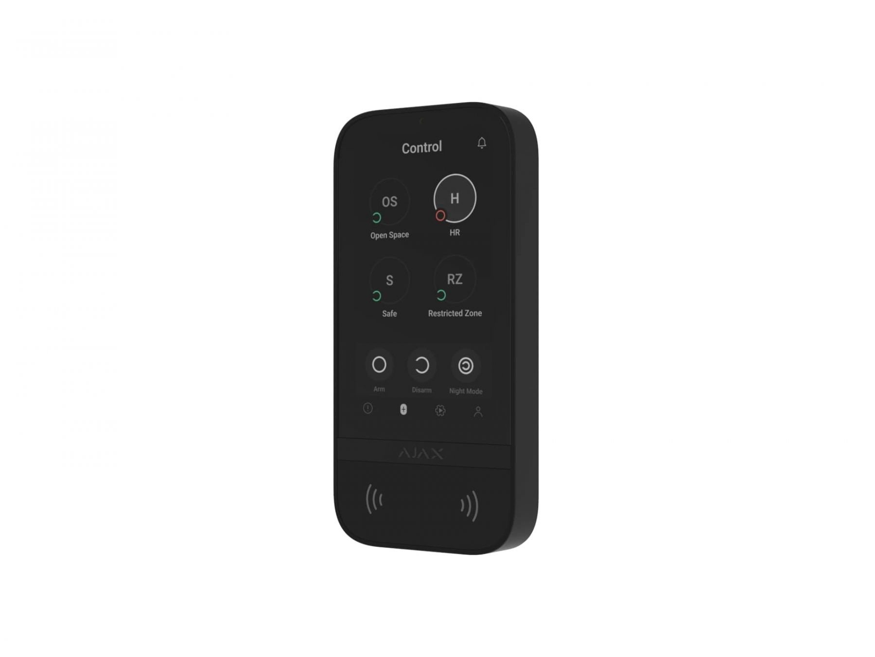 Ajax KeyPad TouchScreen є бездротовою клавіатурою з сенсорним екраном для управління системою безпеки Ajax. Вона підтримує радіопротоколи Jeweller та Wings. Сенсорний екран є ємнісним і має діагональ 5 дюймів з роздільною здатністю 480 × 854 пікселів. Клавіатура дозволяє безконтактний доступ за допомогою карток і брелоків, а також підтримує Bluetooth low energy (BLE). Живиться від 6 батарейок типу AA, а також може працювати від зовнішнього джерела живлення напругою 10,5–14 В і струмом до 0,5 А. Розміри клавіатури становлять 171,5 × 82,1 × 26 мм, вага - 327 г.