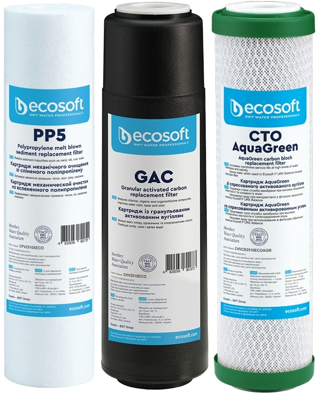 Комплект картриджів Ecosoft 1-2-3 для осмосу Absolute (поліпропілен+GAC+AquaGreen)