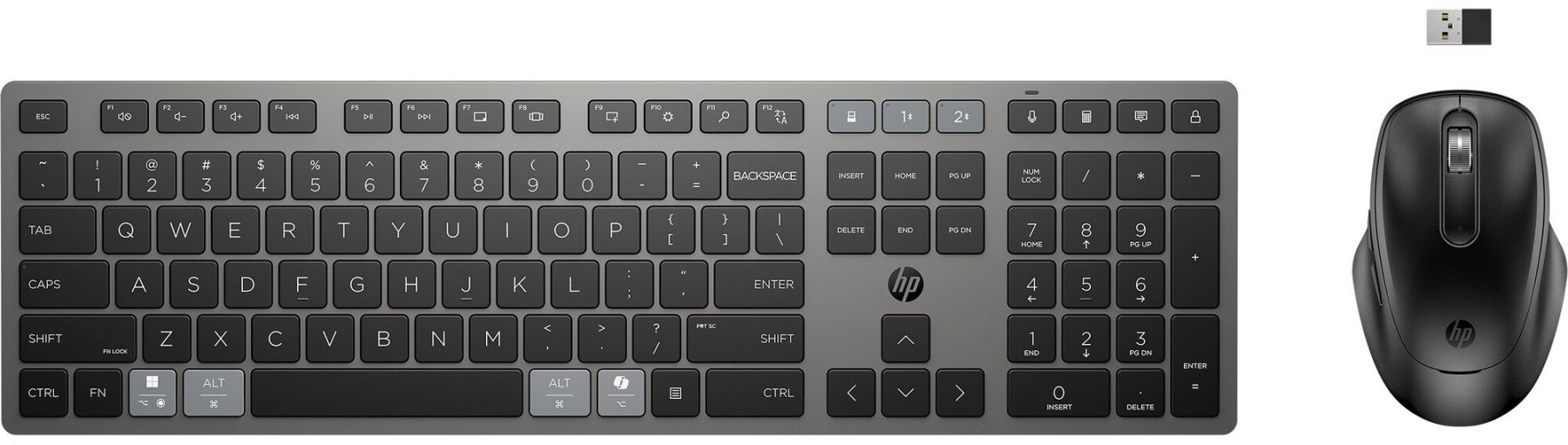 Комплект HP 720 Multi‑Device Rechargeable — бездротова клавіатура з мишкою, що заряджаються за 3 хвилини, забезпечуючи до 2 місяців роботи без підзарядки. Підтримують підключення до трьох пристроїв одночасно (2× Bluetooth, 1× 2,4 ГГц USB‑донгл). Клавіатура має 22 програмовані клавіші, серед яких Copilot‑кнопка, а мишка — 5 кнопок, чутливість до 4000 DPI. Пристрій зроблений з 60 % переробленого пластику, зручно працює з Windows, macOS і ChromeOS — Еко‑дружній вибір високої якості.