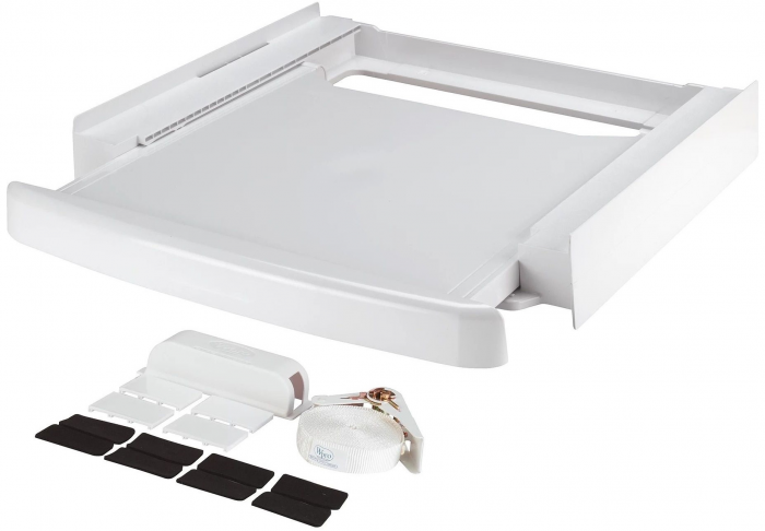 Комплектація і сумісність:для пральних машин, для сушильних машин глибиною 45 - 60 см, Комплект для кріплення з висувною полицею, 8 гумових протиковзких накладок, 4 пластикові жорсткі пластини, 1 кришка "Safe-in-Lock®", 1 ремінь "Safe-in-Lock®" з натяжним пристроєм, інструкція зі встановлення, Рамка для кріплення, 8 гумових протиковзких накладок, 1 ремінь з ручним натяжним пристроєм. інструкція зі встановлення, пральні та сушильні машини глибиною 45-60 см