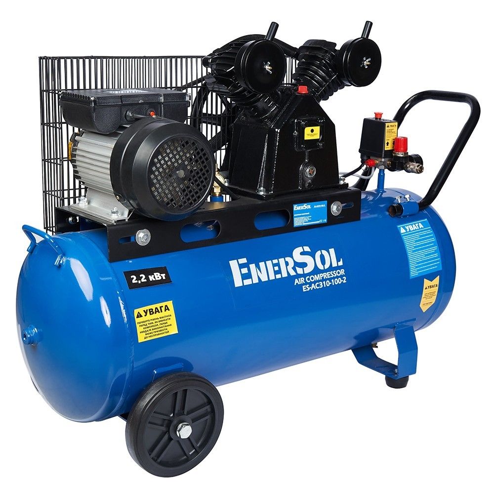 Компресор повітряний EnerSol ES-AC310-100-2 масляний з ресивером 100 л і продуктивністю 311 л/хв на вході забезпечує стабільний потік стисненого повітря для тривалої роботи. Потужність двигуна 2,2 кВт і максимальний тиск 8 бар підходять для живлення пневмоінструменту середньої інтенсивності. Ремінний привід і два циліндри сприяють зниженню навантаження на двигун та підвищенню довговічності.