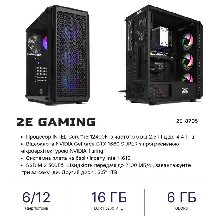 Комп’ютер персональний 2E Complex Gaming Intel i5-12400F/H610/16/500F+1000/NVD1660S-6/Win11H/2E-G338/600W