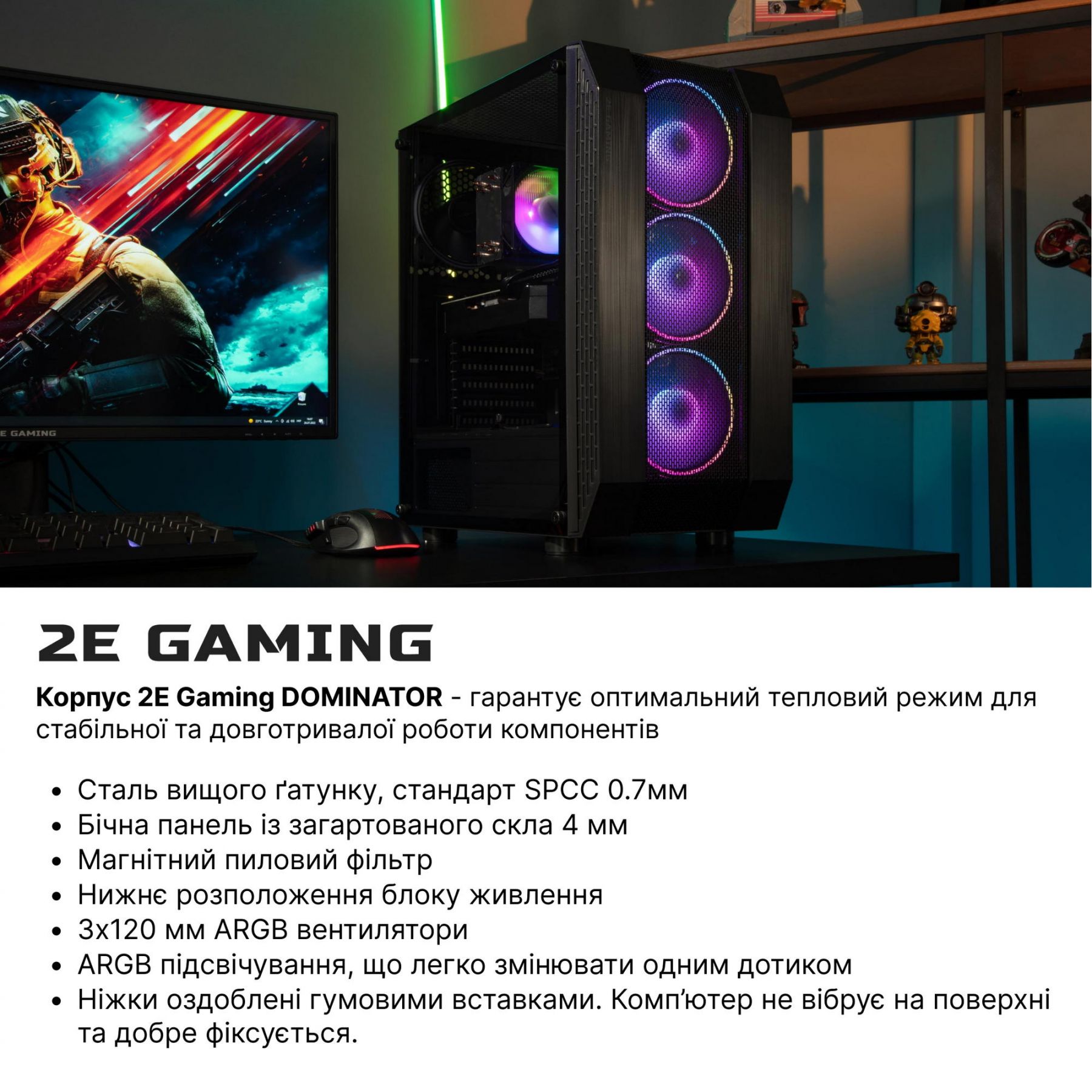 Додатково:Загартоване скло (бічна (ліва) панель), Вентилятори встановлені: передня панель: 3x 120 мм ARGB