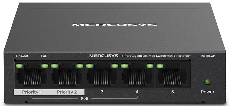 MERCUSYS MS105GP — некерований гігабітний комутатор з 5 портами (4 з підтримкою PoE+). Забезпечує сумарний бюджет живлення 65 Вт, до 30 Вт на порт. Підтримує розширений режим передачі до 250 м та режим ізоляції для безпечного розділення трафіку. Оснащений міцним металевим корпусом, простий у встановленні (Plug and Play).
