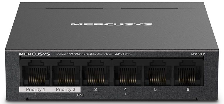MERCUSYS MS106LP – некерований 6-портовий комутатор Fast Ethernet із 4 PoE+ портами. Забезпечує сумарний бюджет живлення 40 Вт (до 30 Вт на порт). Підтримує розширений режим до 250 м, режим ізоляції для безпечного розподілу трафіку та функцію автоматичного відновлення PoE.
