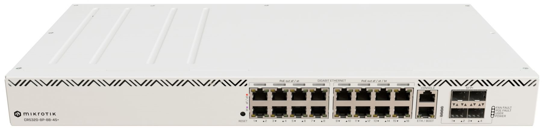 MikroTik CRS320-8P-8B-4S+RM – перший потужний комутатор з підтримкою PoE++ – для простого та економічного живлення пристроїв промислового стандарту 802.3af/at/bt. Забудьте про численні силові кабелі - створіть чистіший простір за допомогою PoE++!