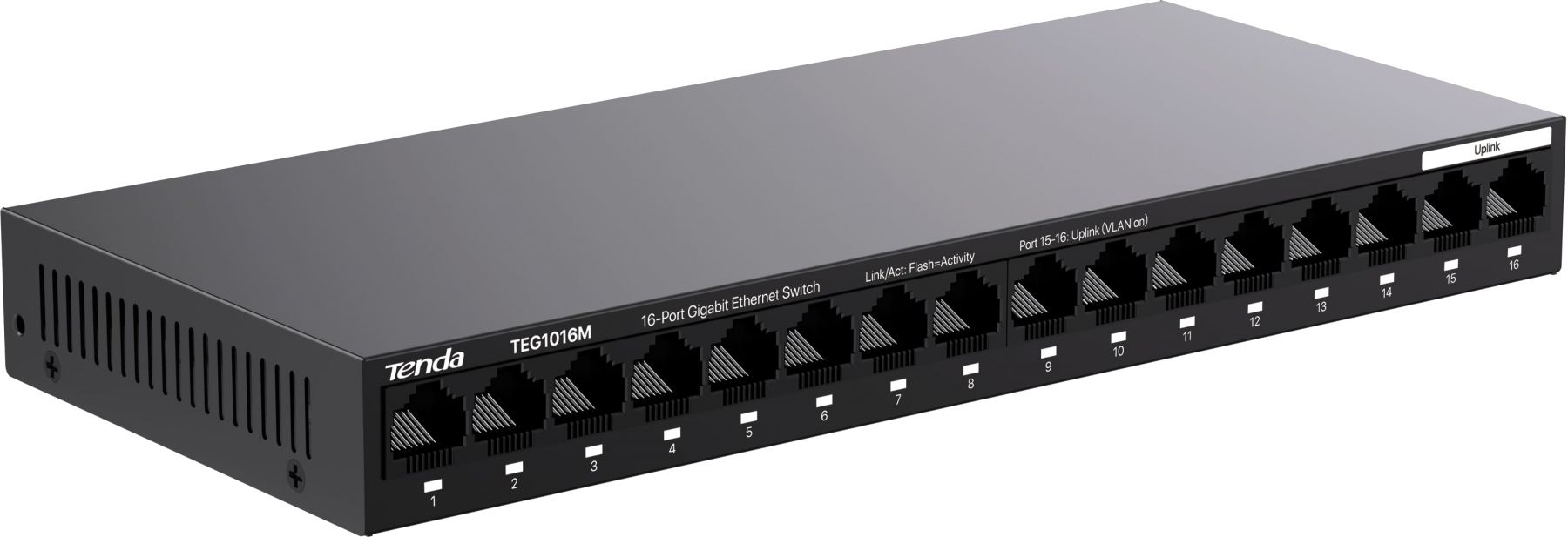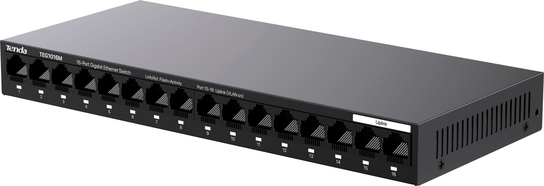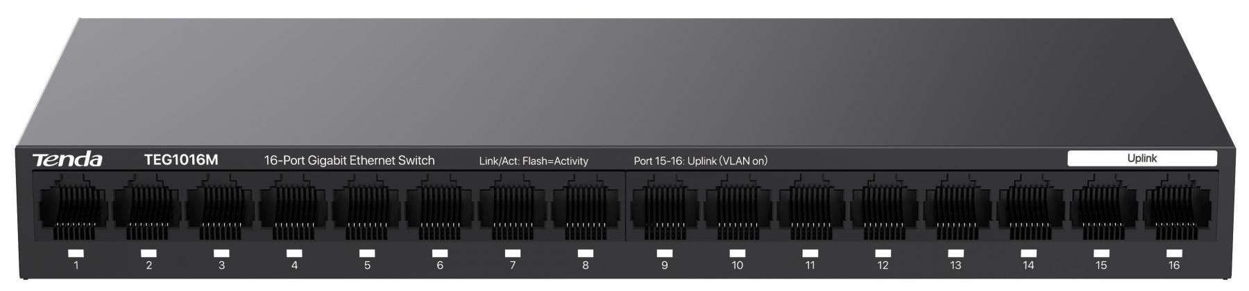 Некерований комутатор TENDA TEG1016M із 16 гігабітними портами Ethernet. Забезпечує пропускну здатність 32 Гбіт/с, має захист від блискавки до 6 кВ та підтримує функцію VLAN одним натисканням.
