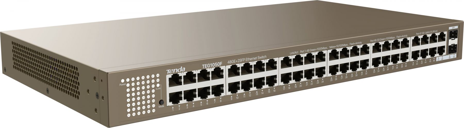 Некерований комутатор TENDA TEG1050F з 48 гігабітними Ethernet-портами та 2 SFP-комбо. Пропускна здатність 100 Гбіт/с, підтримка VLAN одним натисканням та джамбо-фрейми 12K.