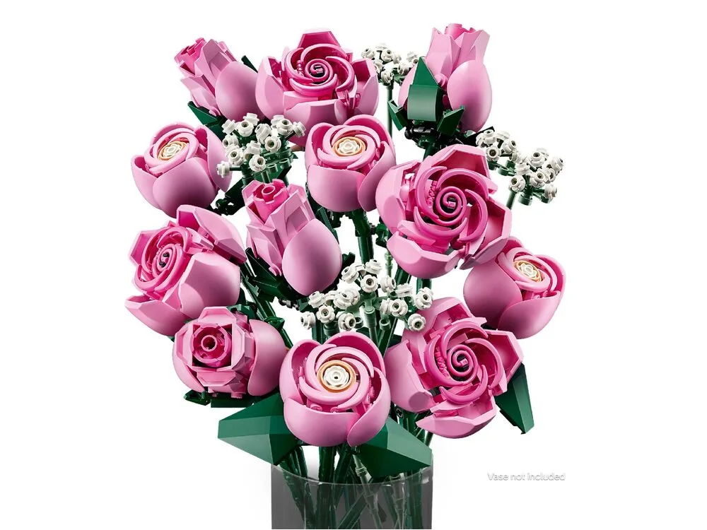 LEGO Botanicals Букет рожевих троянд (10374) дозволяє створити елегантну квіткову композицію з кубиків. У наборі 12 троянд на різних етапах цвітіння та гілочки лищиці з білими квітами. Це стильний подарунок, який квітнутиме вічно.