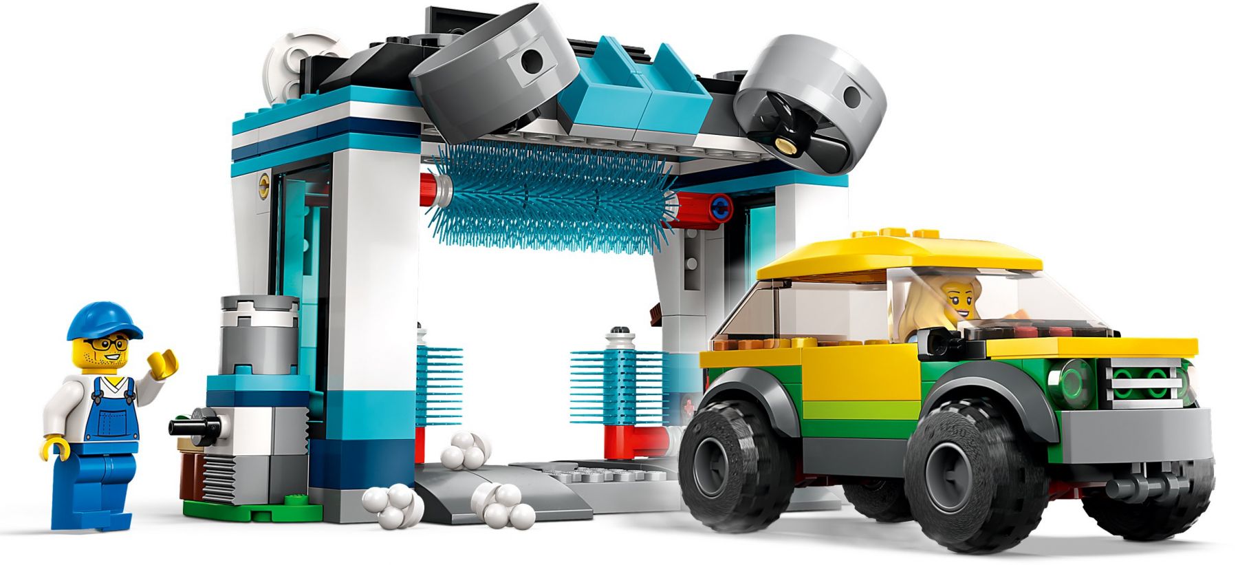 Прямуйте до міської автомийки LEGO® City. Проїдьте, щоб активувати щітки для миття, які обертаються. Нахиліть дозатор, аби розпилити на машину мильну піну. Потім розташуйте вентилятори, щоб висушити автомобіль, перш ніж їхати по колу, аби насосом додати тиску в шинах. Миття автомобіля жодного разу не було таким веселим!
