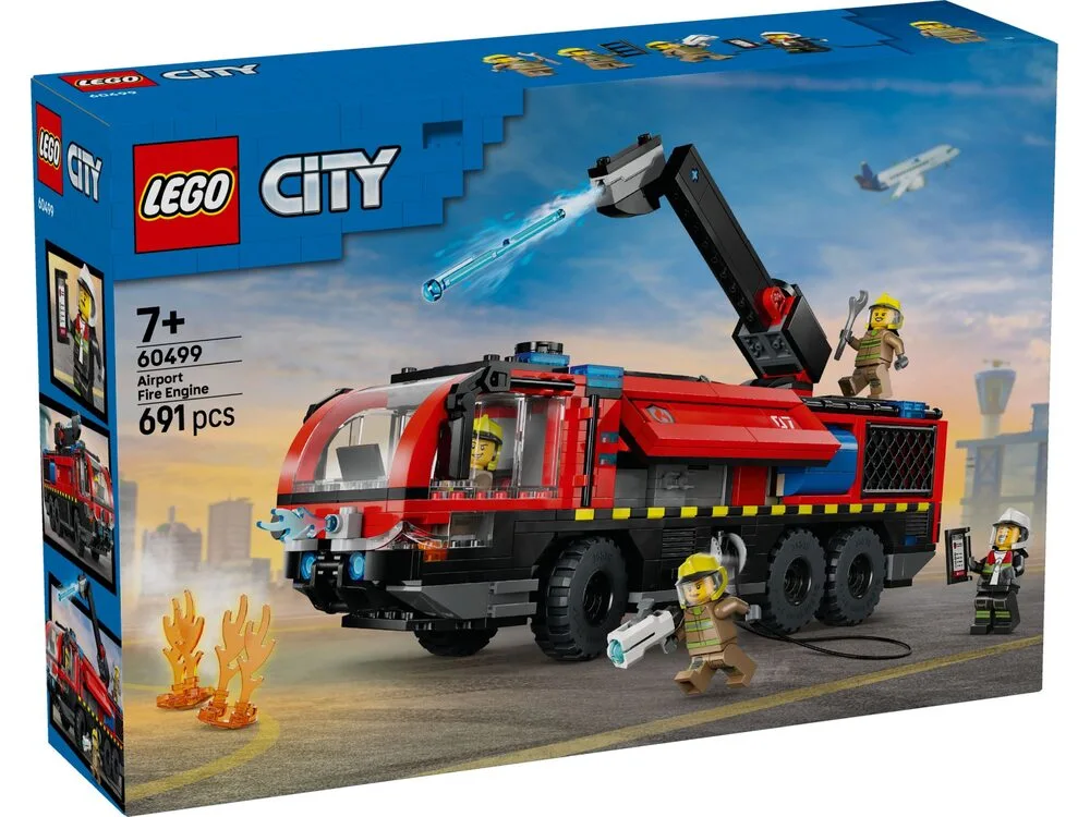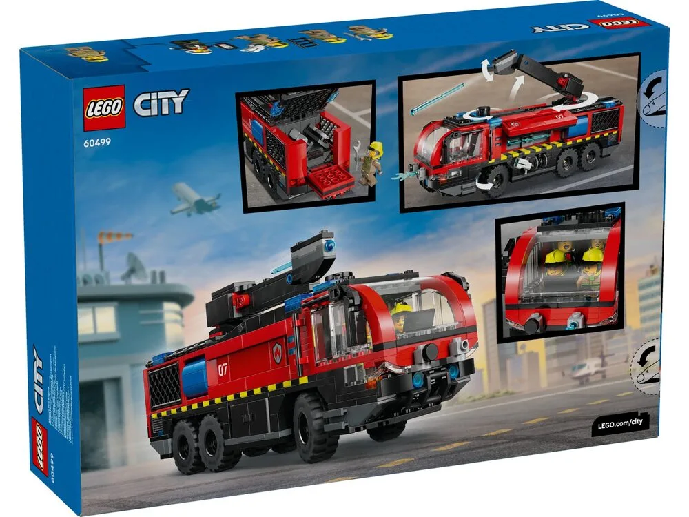 LEGO City Автівки — Пожежна вантажівка в аеропорту (60499) — захопливий набір для дітей від 7 років, що відтворює реалістичну пожежну вантажівку для аеропорту з вогнегасником, що обертається на 360° на даху, боковими відсіками для обладнання та місцями для 4 мініфігурок пожежників. Діти можуть керувати вантажівкою за допомогою ручки, запускати водяні елементи з вогнегасника та знімати двигун для «ремонту». У комплекті 4 мініфігурки пожежників для сюжетних ігор у світі аеропорту. Набір розвиває уяву та навички рольової гри. Містить 691 деталь та інструкції в додатку LEGO Builder з 3D-переглядом.