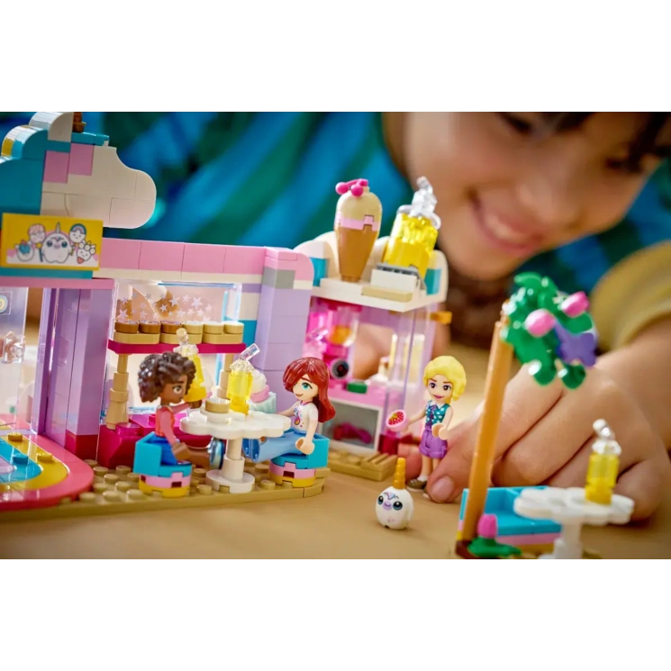 LEGO® Friends 42684 Кав'ярня мрій єдинорога — яскравий набір для дітей від 6 років, що поєднує солодощі, фантазію та сюжетну гру. У кав’ярні з єдинорогом є вітрина з десертами, бар із напоями та зони відпочинку всередині й зовні. У комплекті 3 мініляльки та багато тематичних аксесуарів для історій. Обертовий столик і плюшевий єдиноріг додають атмосферності. 475 деталей і 3D-інструкції в LEGO Builder.