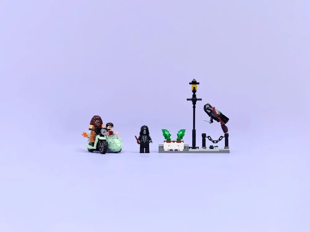 LEGO® Harry Potter™ 76459 Геґрід і Гаррі: Втеча з Тисової вулиці відтворює сцену з фільму «Гаррі Поттер і смертельні реліквії». У наборі — летючий мотоцикл Геґріда в масштабі мініфігурок, 4 персонажі та мінімодель Тисової вулиці з інтерактивними елементами. Гаррі розміщується в колясці, а смертежери — на вулиці з ліхтарем і підставкою для горщиків, які можна перекинути під час втечі. Інструкції доступні також у додатку LEGO Builder. Набір містить 124 деталі та підходить для дітей від 8 років.