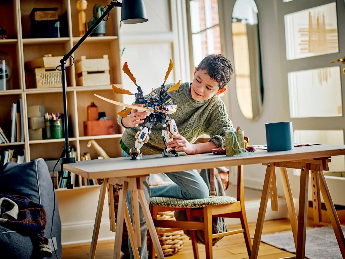 Пригодницька іграшка «Драконовий робот-титан Коула» (71821) дозволяє хлопчикам і дівчаткам віком від 12 років розігрувати сюжети другого сезону серіалу NINJAGO® Повстання драконів. Це найбільший за весь час робот-титан NINJAGO, який має рухомі руки, ноги, голову, тулуб, точки оберту й суглоби, щоб діти могли ставити його в бойові позиції, і пару рухомих крил дракона й великий меч.