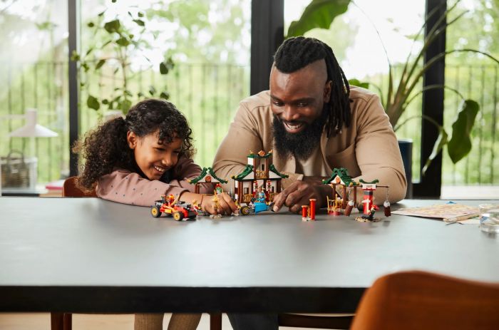 Відпрацьовуйте власні навички з Нією, Каєм і майстром Ву в додзьо ніндзя. Розвивайте свою силу і спритність на тренувальному майданчику смуги перешкод, але будьте напоготові, тому що мисливець-скелет хоче увірватися всередину! Приготуйся рушити на автомобілі ніндзя або на мотоциклі, щоб протистояти ворогу. Ви також можете використовувати 530 деталей із коробки з кубиками, щоб створити нові моделі ніндзя, запропоновані в інструкції.