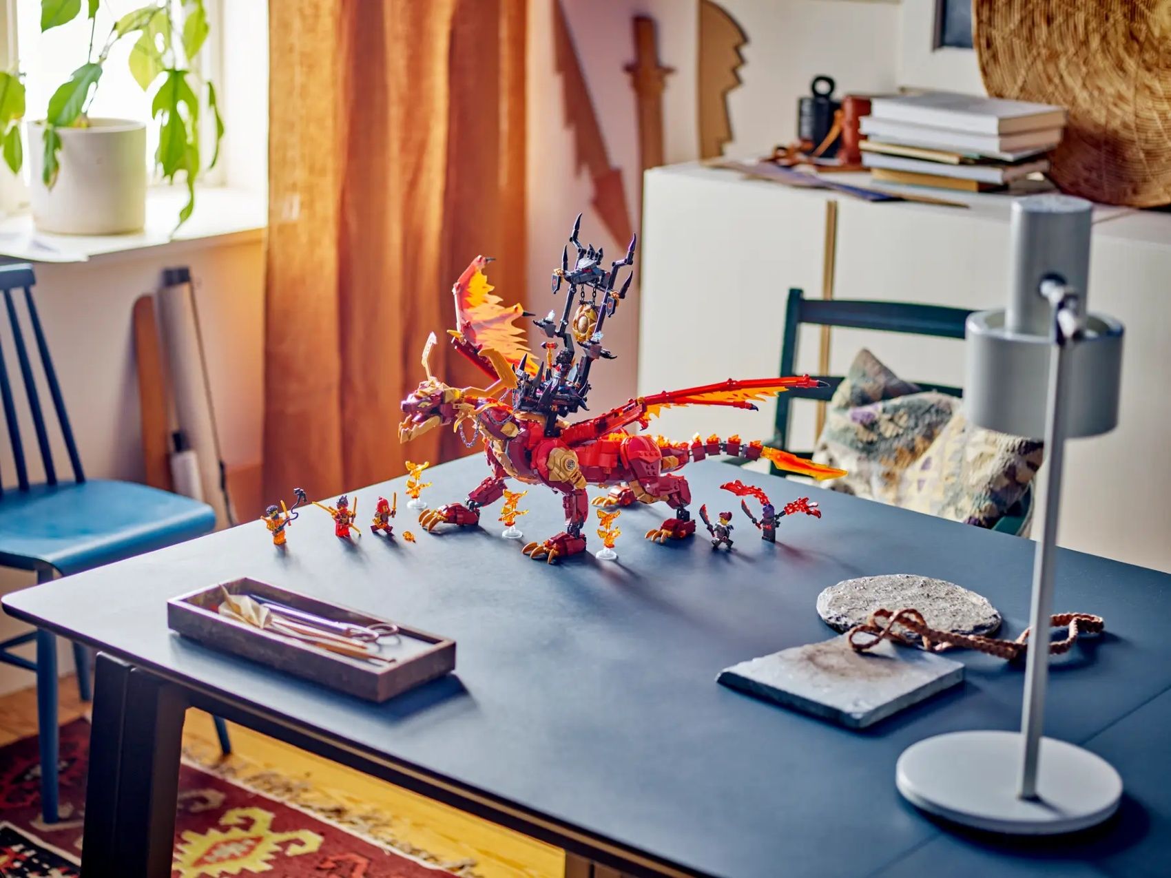 Діти віком від 12 років оживляють повітряні пригоди з другого сезону серіалу NINJAGO® Повстання драконів завдяки цій дивовижній пригодницькій іграшці «Першодракон руху» (71822). Це найбільший в історії LEGO® іграшковий дракон, що має рухливі кінцівки, хвіст, стегна, щелепи, голову, шию і великі крила.