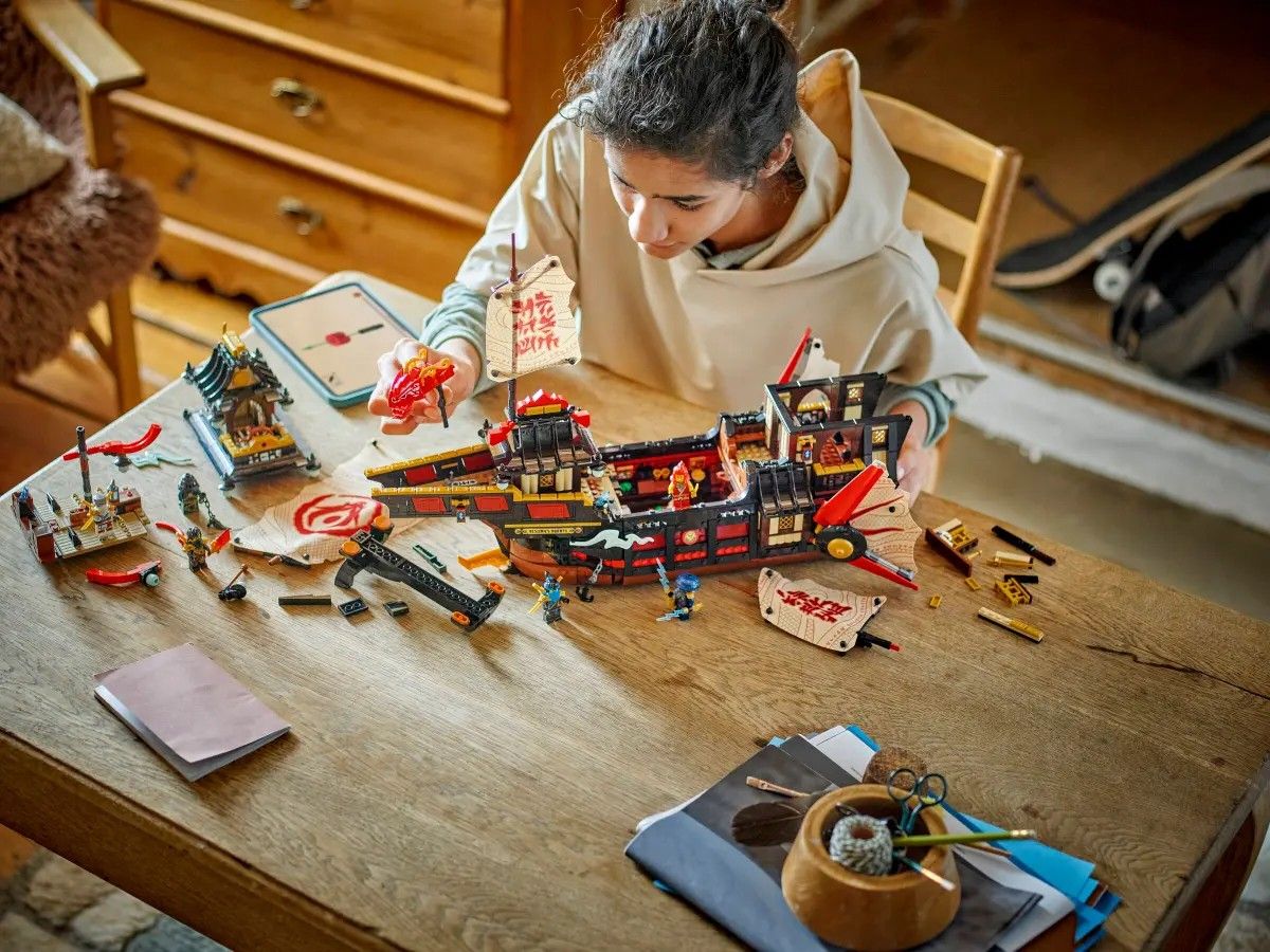 LEGO Ninjago «Щедрість храму» (71848) — масштабний набір із серії Dragons Rising із детальним кораблем ніндзя. Модель поєднує ігровий функціонал і можливості для експонування. Конструкція включає рухомі елементи та внутрішні приміщення. Підходить для складного складання та сюжетної гри.