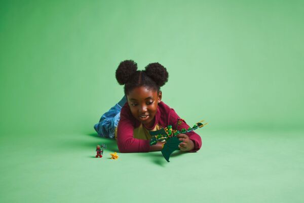 Конструктор LEGO NINJAGO Зелений лісовий дракон Ллойда (71829) містить 128 деталей для збирання рухливого дракона з хвостом, шиєю, ногами, великими крилами та руками. Дракон має сідло для мініфігурки, що дає змогу відтворювати польоти та битви. У наборі присутні 2 мініфігурки: Ллойд із золотою катаною та розвідник-драконів із сокирою, а також золота модель малюка-дракона. Діти відтворюють сцени з 3 сезону серіалу NINJAGO: Повстання драконів. Збирання відбувається за допомогою додатка LEGO Builder.