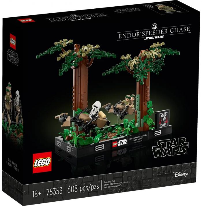 Передайте динаміку захопливої сцени з фільму «Зоряні війни: Повернення джедая» з допомогою діорами LEGO® Star Wars™ «Погоня на спідері на Ендорі» (75353). Вона містить три мініфігурки LEGO (принцеса Лея, Люк Скайвокер і розвідник), два швидкісних мотоцикли з прозорими елементами, щоб ви могли поставити їх під різними кутами, ніби вони летять через ліси Ендору, два дерева, які можна зібрати, і нові елементи папороті, що з'являться у травні 2023 року. Доповнює цей конструктор табличка зі словами Люка Скайвокера («Швидше! Заглуши їхній зв'язок. Центральний перемикач!») і табличка з логотипом 40-ї річниці фільму «Зоряні війни: Повернення джедая».