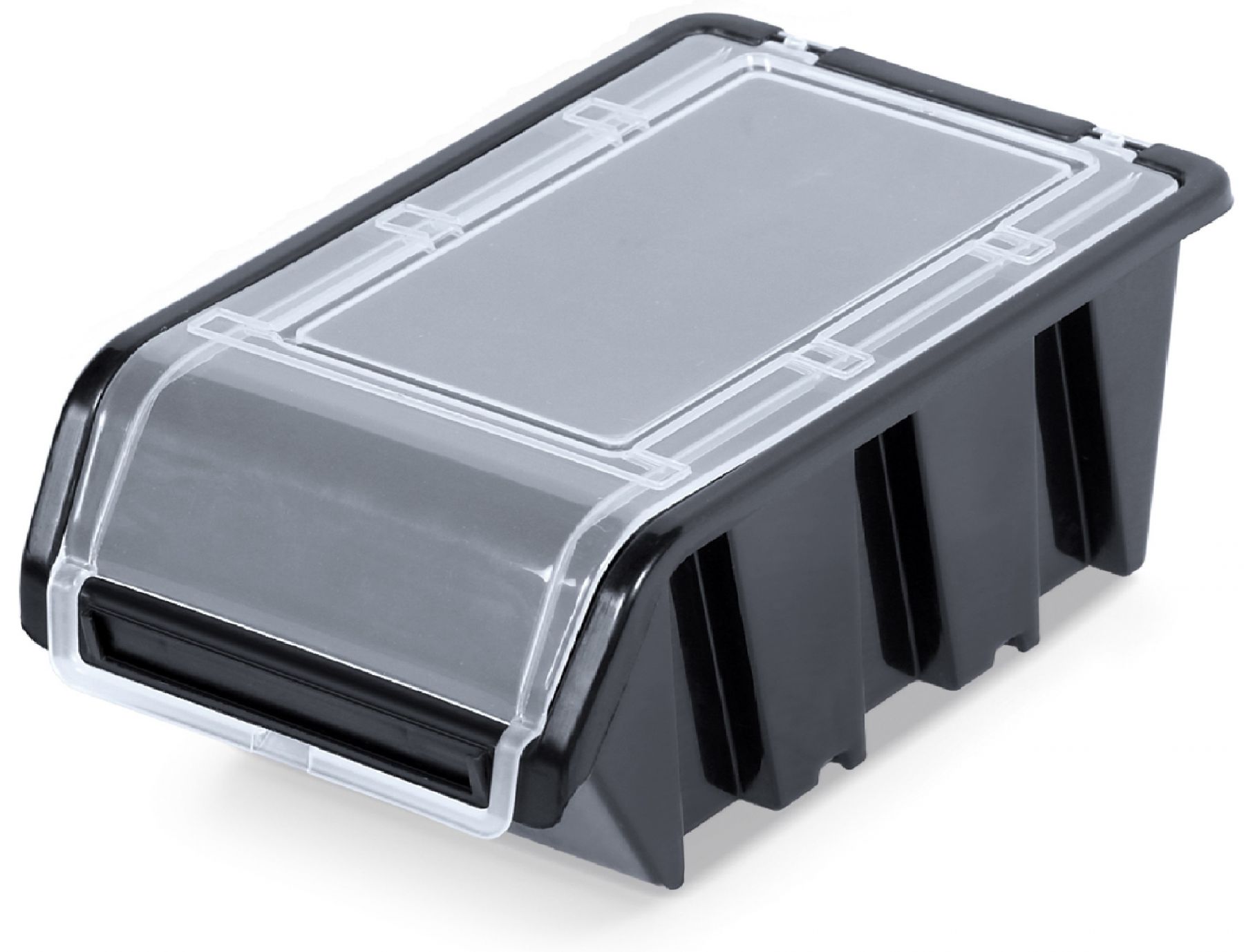 Компактний і міцний контейнер чорного кольору з пластику, підходить для зберігання дрібних предметів, з зручною кришкою для захисту вмісту. Розмір 15,5x10x7см.