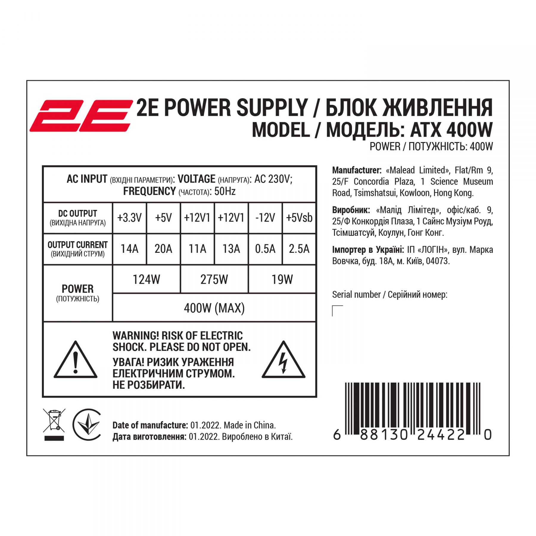 Потужність комплектного БЖ:400 Вт