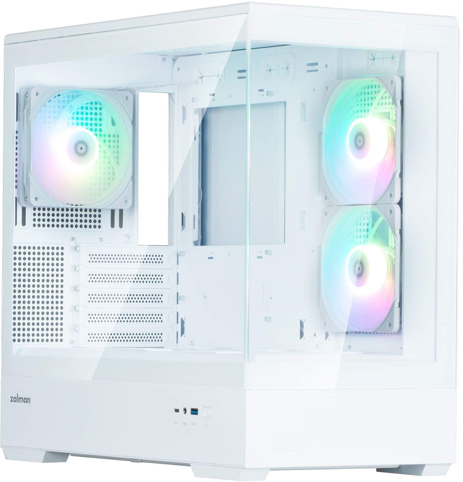 Панорамний корпус Zalman P30 WHITE V2 для сучасної домашньої чи ігрової станції, сумісний із актуальними компонентами. Передня та бічна панелі із загартованого скла. Забезпечено активне обдування компонентів за рахунок перфорації металевої поверхні панелей корпусу. Продумано захист від пилу. У комплекті 3х120мм ARGB вбудованих вентиляторів. Вентилятори на бічній панелі – реверсні: забезпечують постачання повітря ззовні. Вентилятор на задній панелі працює на видуві. Корпус укомплектований усіма необхідними деталями для складання та подальшої експлуатації, є стандартні сучасні актуальні інтерфейси та роз'єми.