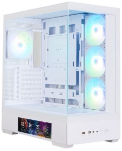Панорамний корпус Zalman P40 DS WHITE з 9,1 дюймовим дисплеєм для сучасної домашньої або ігрової станції, сумісний із актуальними компонентами та адаптований для BTF материнських плат. Передня та бічна панелі із загартованого скла. Забезпечено активне обдування компонентів за рахунок перфорації металевої поверхні панелей корпусу. Продумано захист від пилу. У комплекті 4 х 120мм ARGB вбудованих вентиляторів, концентратор та тримач для відеоадаптера. Вентилятори на бічній панелі – реверсні: забезпечують приплив повітря ззовні. Вентилятор на задній панелі працює на видув. Додаткова опція – дисплей з роздільною здатністю 1920х462 на бічній панелі, який демонструє в реальному часі інформацію про процесор, відеоадаптер, пам'ять і вентилятори корпусу. Корпус укомплектований усіма необхідними деталями для складання та подальшої експлуатації, в наявності стандартні сучасні актуальні інтерфейси, роз'єми, а також програмне забезпечення, яке можна завантажити з офіційного сайту виробника.