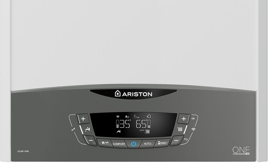 Конденсаційний двоконтурний котел Ariston CLAS ONE WIFI 30 потужністю 30 кВт призначений для опалення та гарячого водопостачання. Вбудований Wi-Fi-модем забезпечує дистанційне керування через додаток Ariston NET. Модуляція потужності 1:8 та режими Comfort / Comfort Plus підтримують стабільну температуру гарячої води з мінімальною затримкою. РК-дисплей відображає поточні параметри та стани системи.