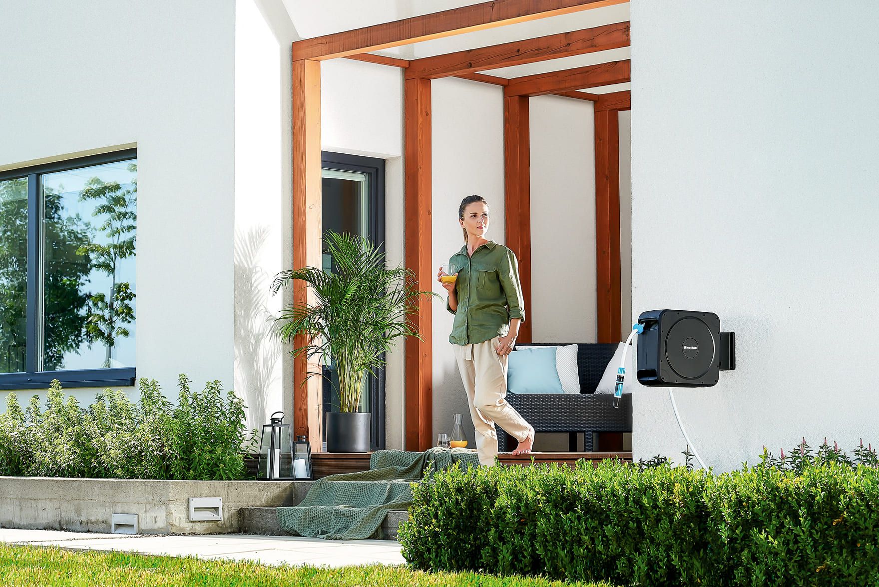 Автоматична шлангова котушка ERGO виготовлена з високоякісного матеріалу, стійкого до ультрафіолету. Котушка кріпиться до стіни й може обертатися на 180°.