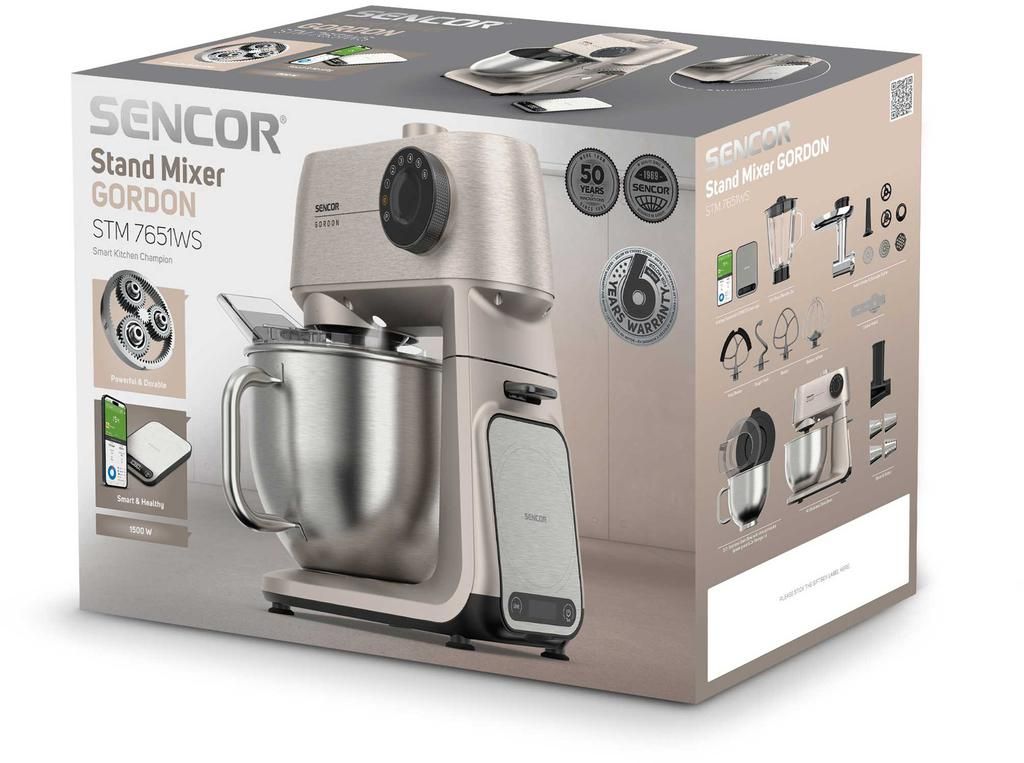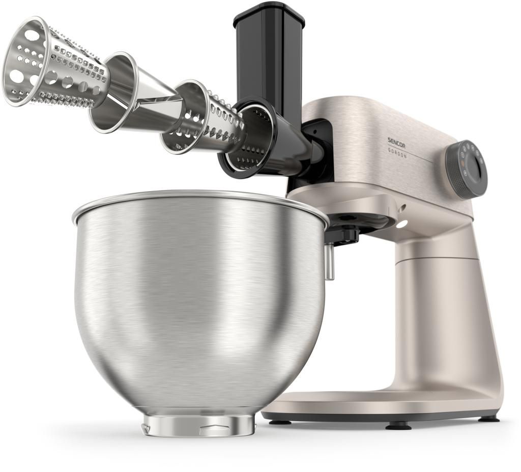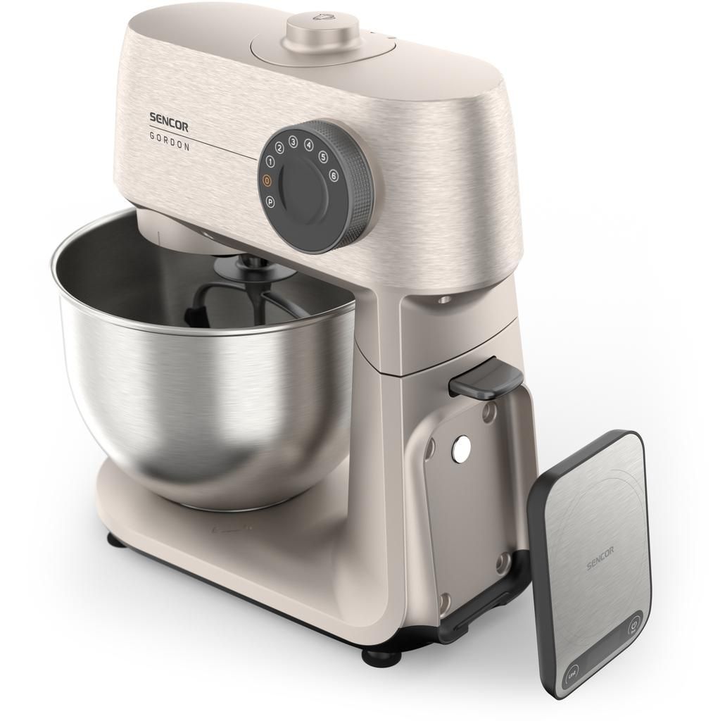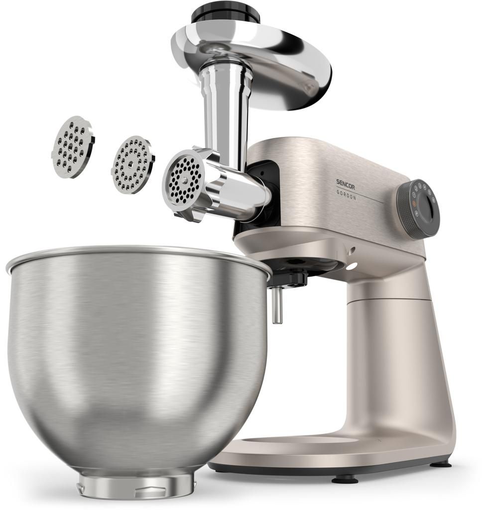 Sencor Gordon — стаціонарна кухонна машина з двигуном потужністю 1500 Вт і повністю металевим корпусом. Оснащена двома чашами з нержавіючої сталі (5,5 л та 4 л) і комплектом із 20 насадок для замішування, подрібнення, збивання та нарізання. М’ясорубка, блендер 1,5 л і тертка з конусами з нержавіючої сталі розширюють функціональність. Підтримка розумних ваг, сумісних із застосунком SENCOR Food, доповнює можливості точного приготування.