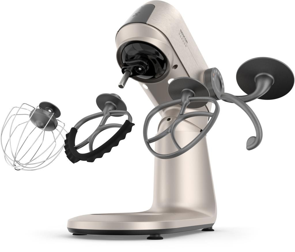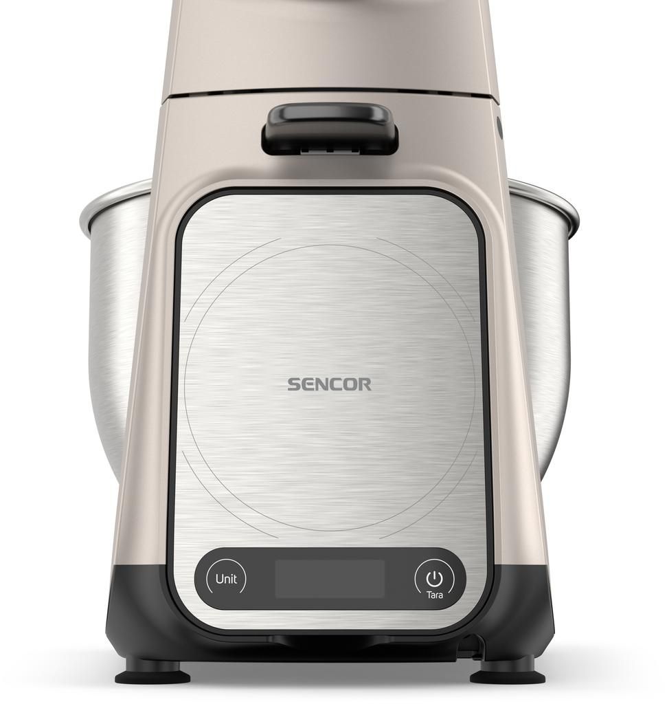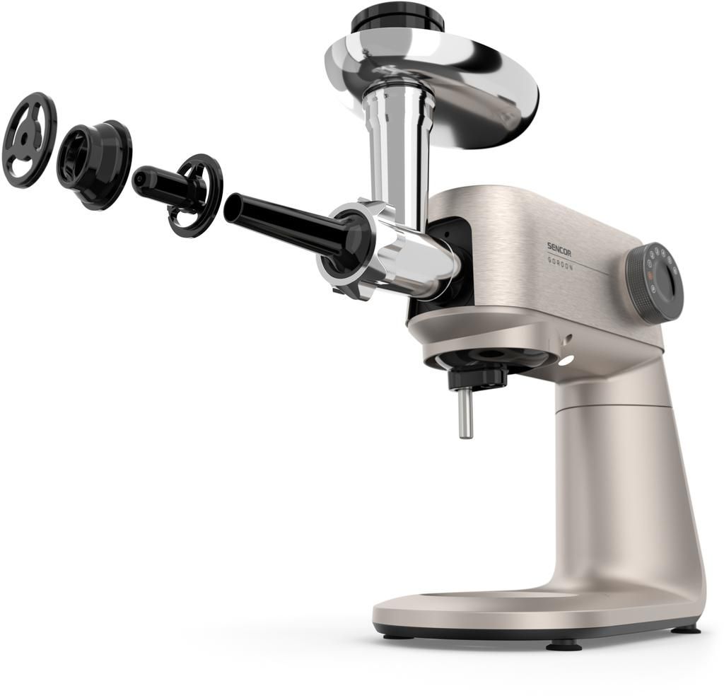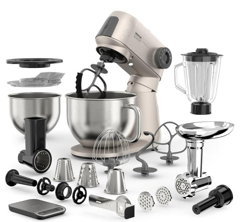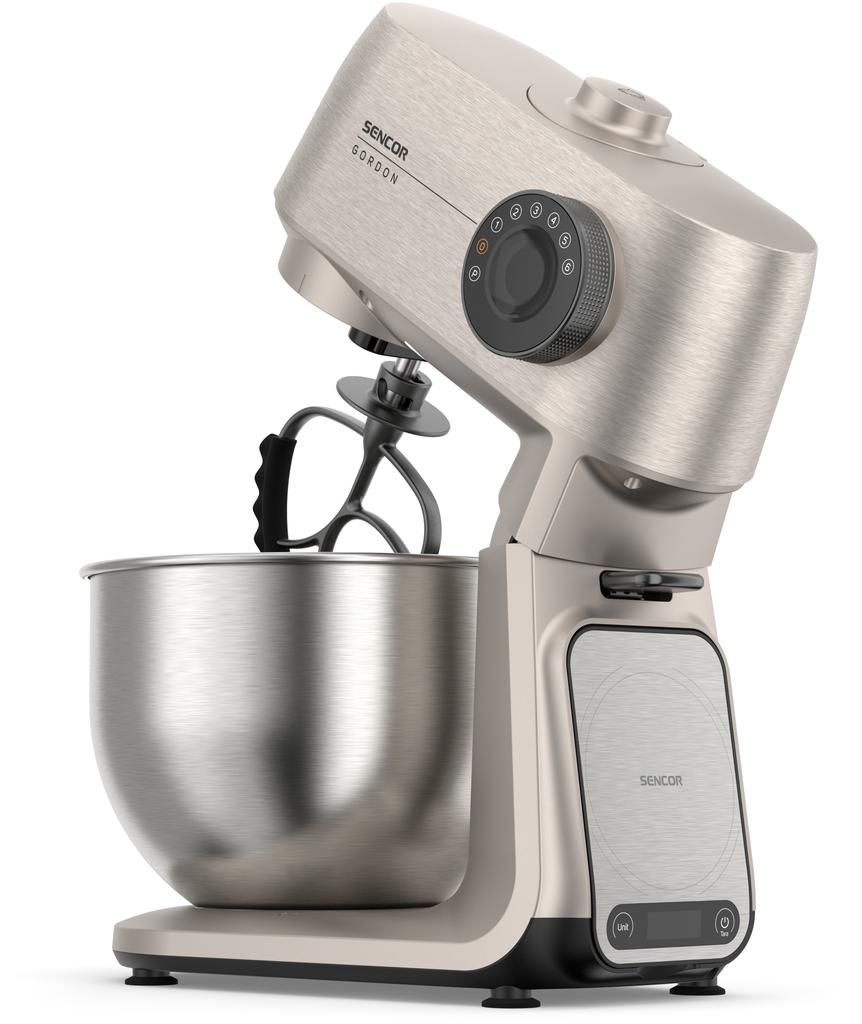 Sencor Gordon — стаціонарна кухонна машина з двигуном потужністю 1500 Вт і повністю металевим корпусом. Оснащена двома чашами з нержавіючої сталі (5,5 л та 4 л) і комплектом із 20 насадок для замішування, подрібнення, збивання та нарізання. М’ясорубка, блендер 1,5 л і тертка з конусами з нержавіючої сталі розширюють функціональність. Підтримка розумних ваг, сумісних із застосунком SENCOR Food, доповнює можливості точного приготування.
