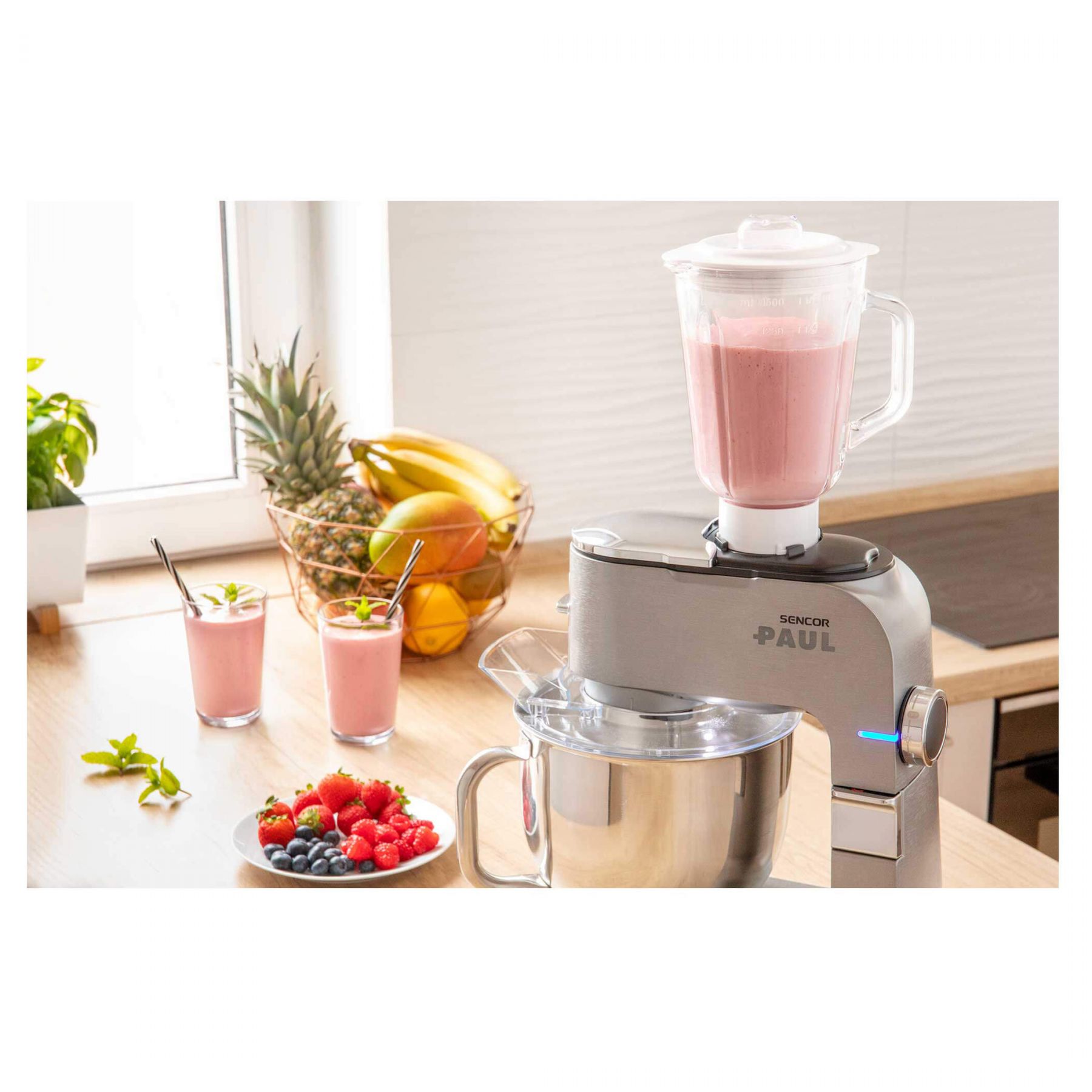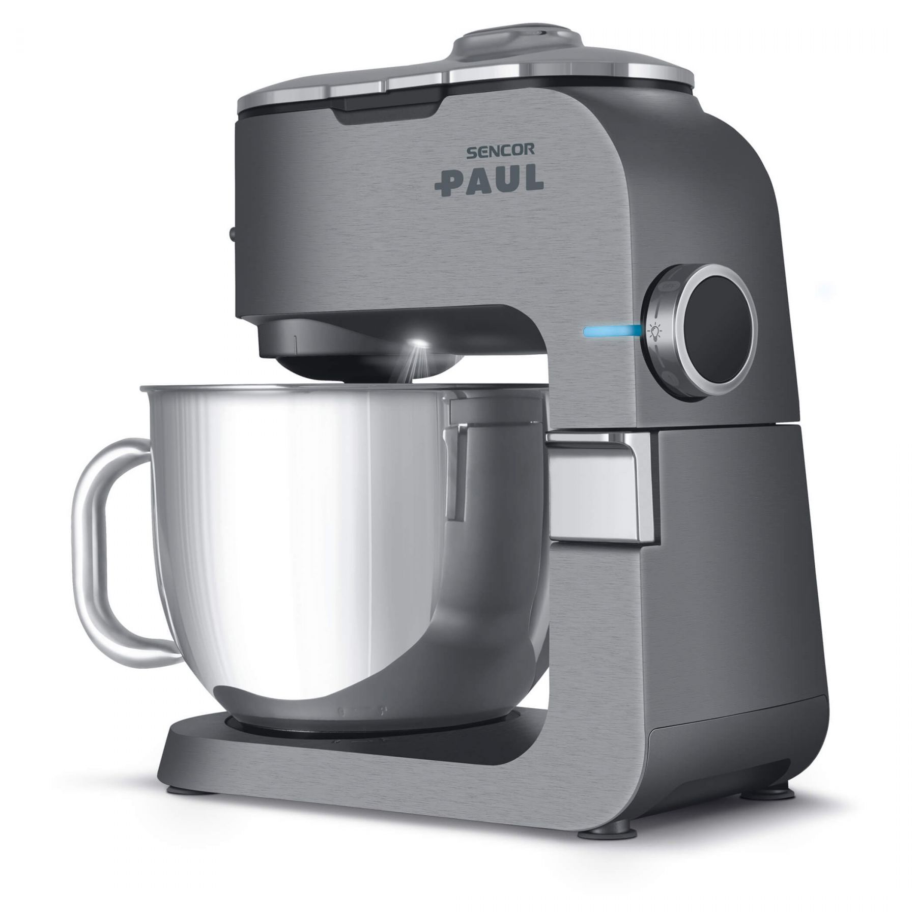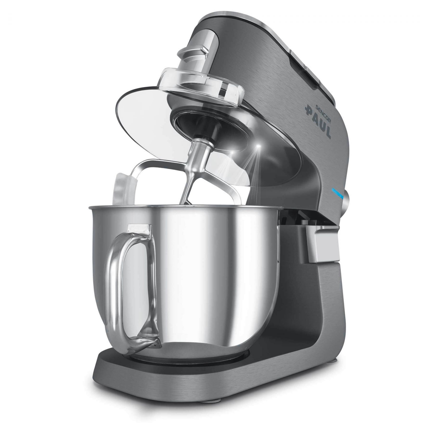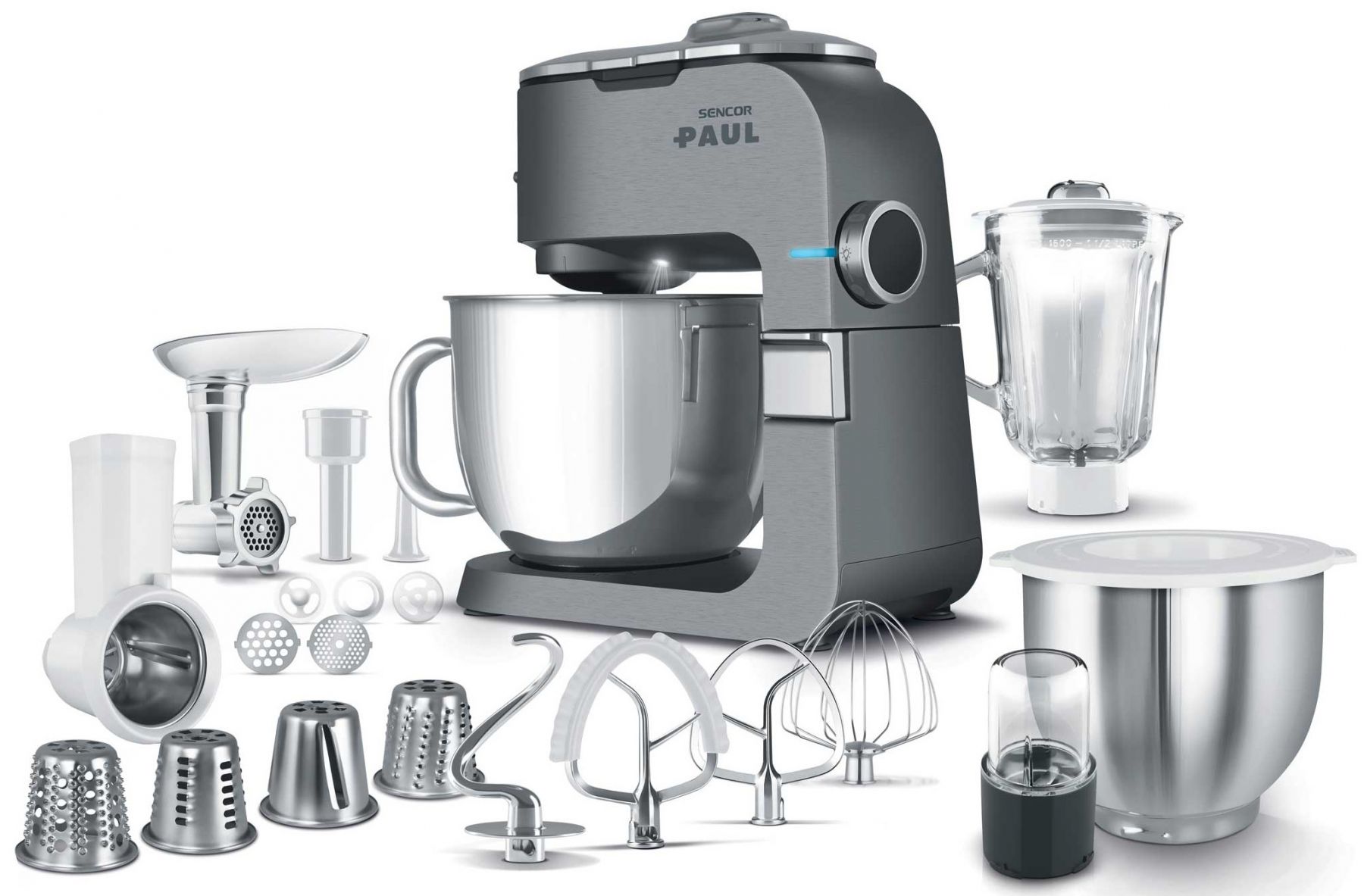 Sencor Paul 1 — кухонна машина з двигуном 1700 Вт і 6-річною гарантією на мотор. Оснащена металевим корпусом із металевими шестернями та конструкцією з трьома приводами. Дві чаші з нержавіючої сталі (6,5 л і 6 л) та 20 насадок розширюють можливості оброблення продуктів. Підтримує функцію імпульсу та систему Sencor Smart Power & Energy для контролю швидкості.