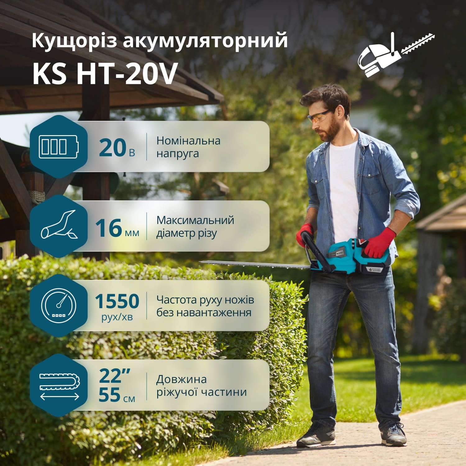 Кущоріз акумуляторний Konner&Sohnen KS HT-20V 20В акб 1х2А·год 55см крок різу 16мм 2.5кг