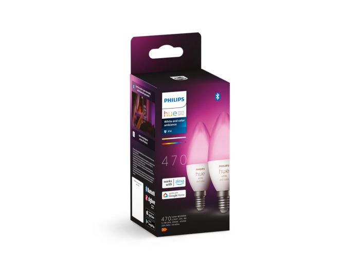 Створіть унікальну атмосферу кольору в будь-якій кімнаті за допомогою двох розумних ламп Philips Hue з цоколем E14 і формою у вигляді свічки. Вони можуть забезпечити тепле або холодне біле світло, а також 16 мільйонів відтінків інших кольорів. Використовуйте свій смартфон та зв'язок Bluetooth для миттєвого керування освітленням в одній кімнаті або підключіться до блоку керування Philips Hue Bridge, щоб скористатися повним набором функцій розумного персонального освітлення Philips Hue.