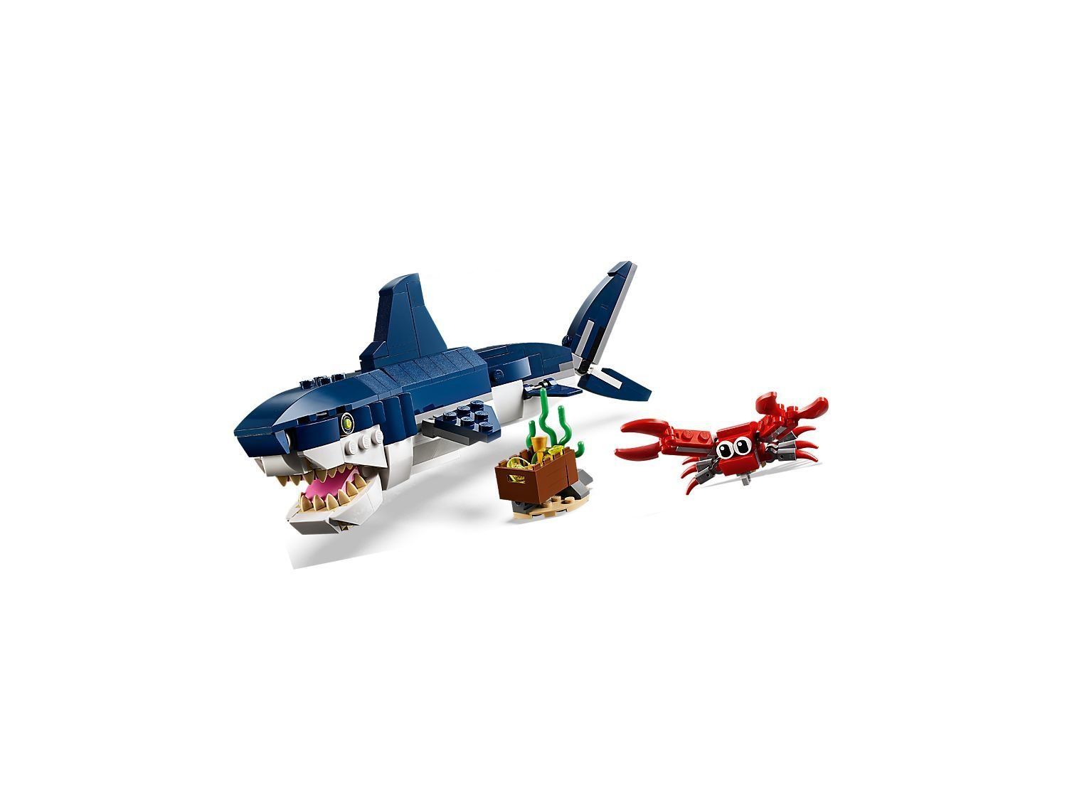 Поринь в океан пригод разом з Мешканцями морських глибин з набору LEGO Creator 3 в 1. Допоможи милому глибоководному крабові захистити скриню зі скарбами від величезної зубастої акули зі світловідбиваючими очима і потужним рухомим хвостом. Потім перероби його в кальмара з гнучкими щупальцями або рибу-вудильника з гігантським ротом.